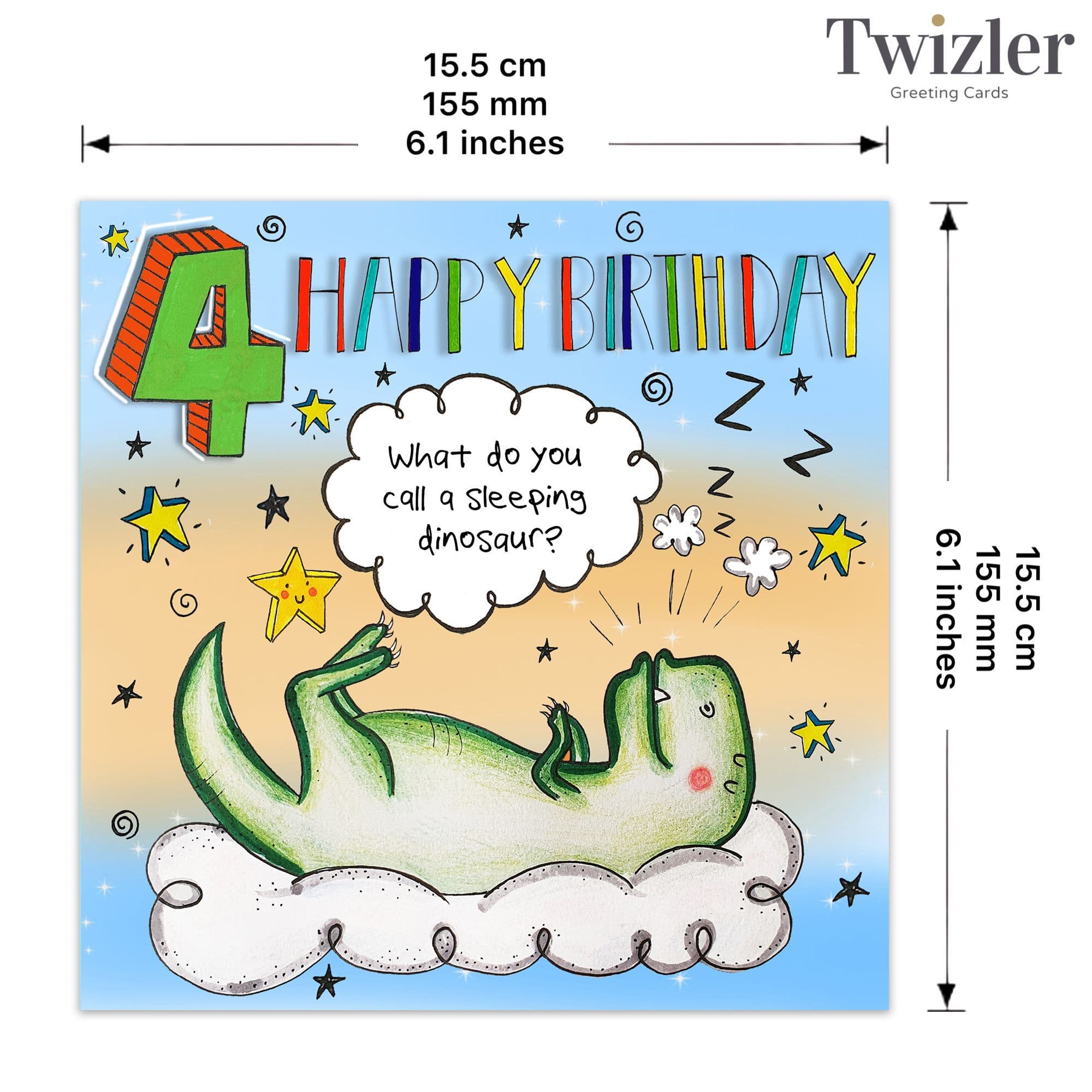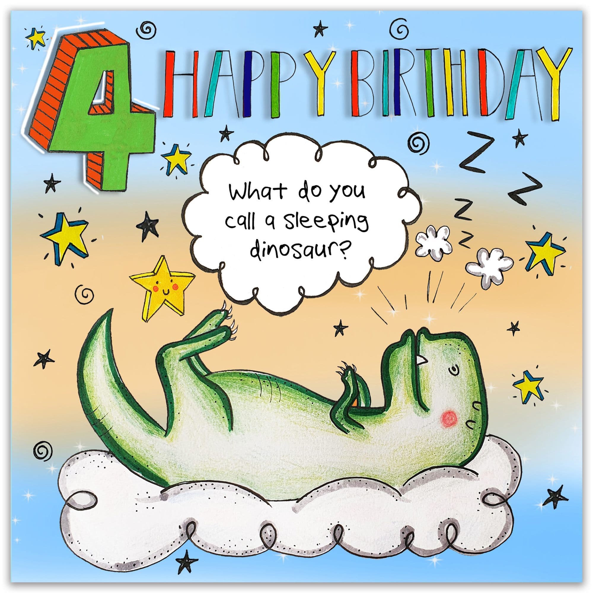 The words on the front of the card read 4 HAPPY BIRTHDAY What do you call a sleeping dinosaur?