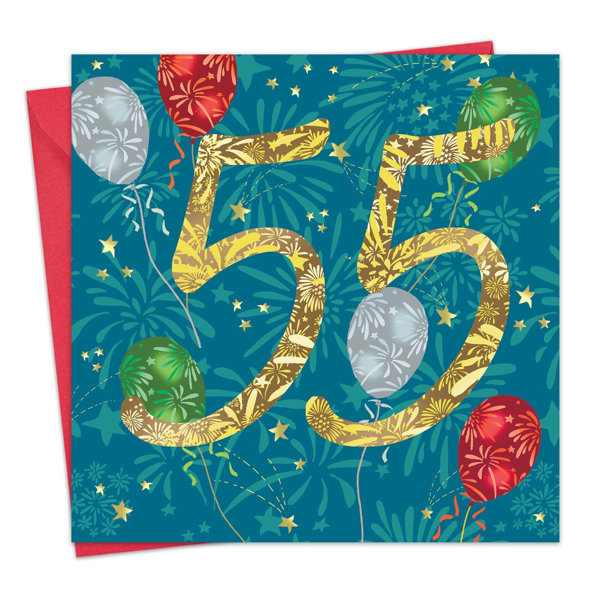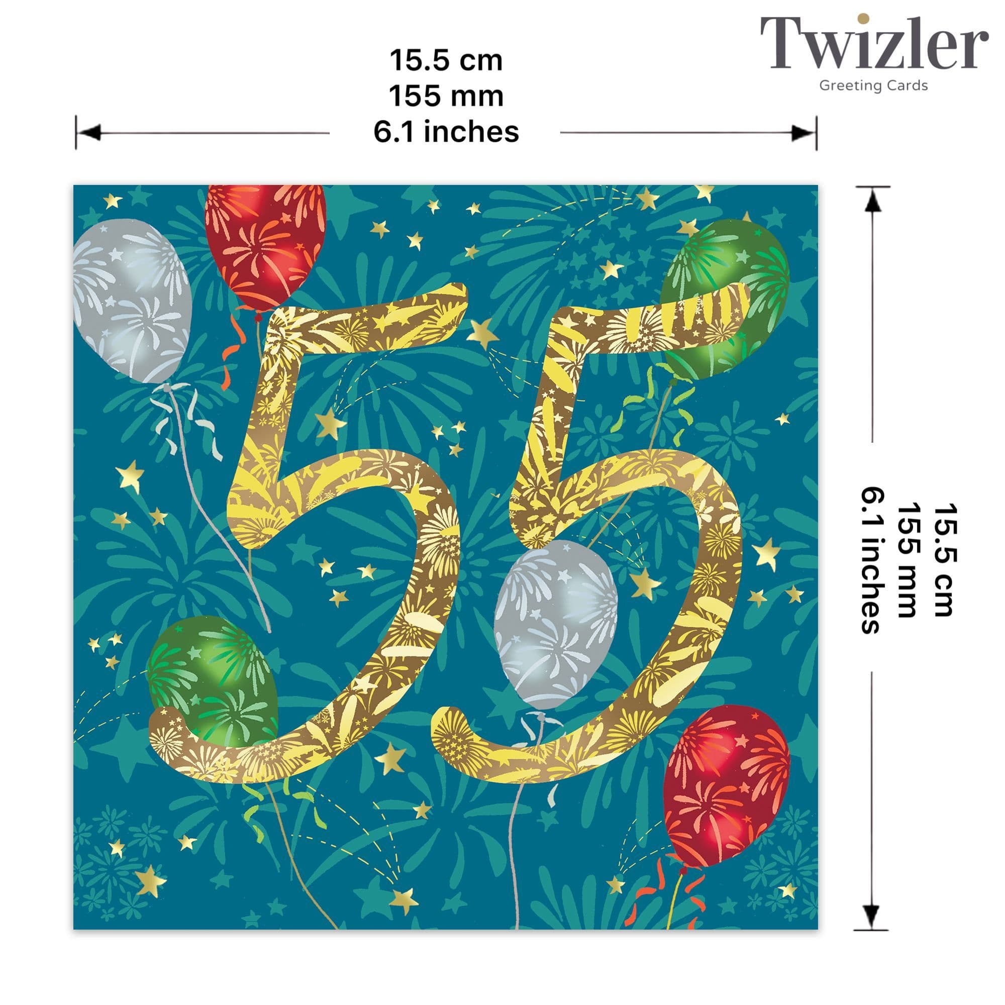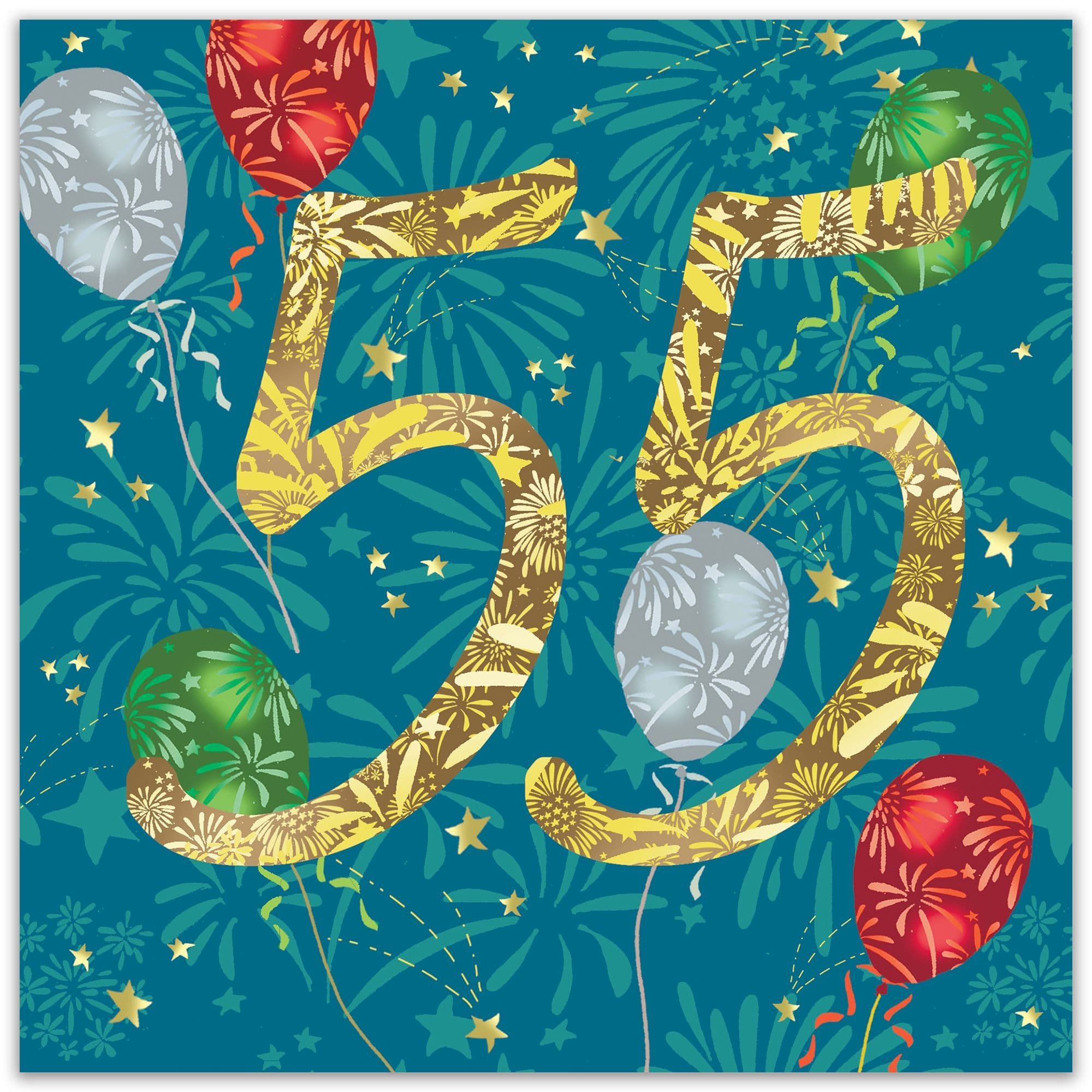 55th birthday cards can be hard to find - but here at Twizler we believe that the mid-decade cards are all the rage! The image features a gold effect number 55 with coloured balloons, stars and exploding fireworks. Our gender neutral design means it's perfect for celebrating that special 55th birthday - for her or for him. The words on the front of the card read 55