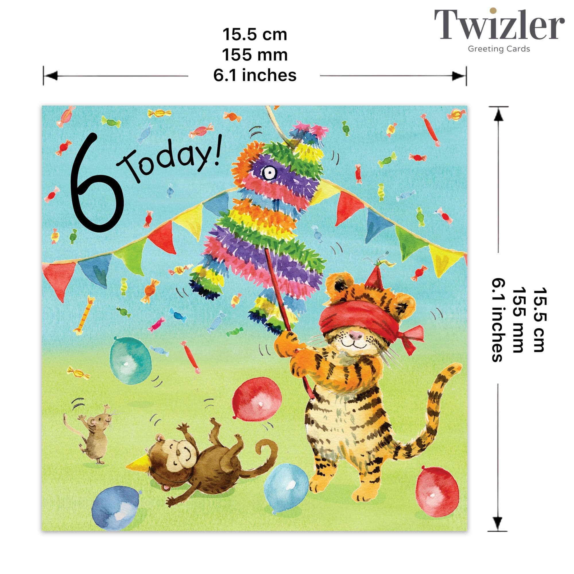 A gorgeous and fun card to send a special 6 year old on their birthday. It features a blindfolded tiger hitting a colourful llama pinata, with special animal friends looking on. There is bunting and balloons all around. A beautifully illustrated and colourful card perfect for either a boy or girl on their 6th birthday. This card reads Happy Birthday on the inside.