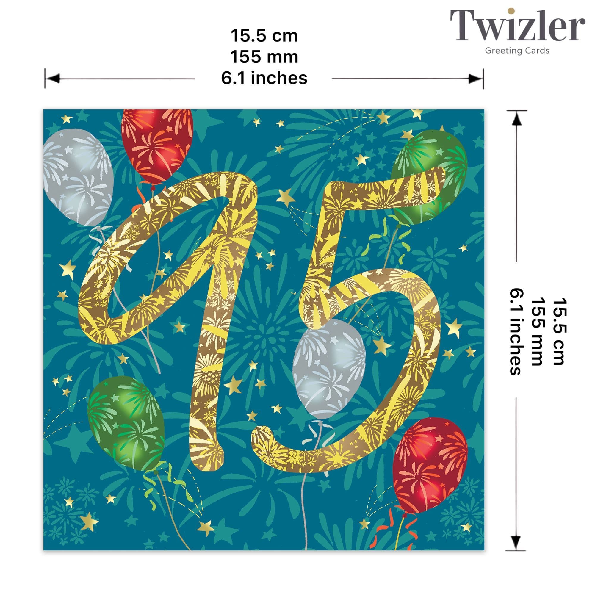 95th birthday cards can be hard to find - but here at Twizler we believe that reaching 95 years old is an achievement of epic proportions and deserves a milestone card! The image features a gold effect number 95 with coloured balloons, stars and exploding fireworks. Our gender neutral design means it's perfect for celebrating that special 95th birthday - for her or for him. The words on the front of the card read 95