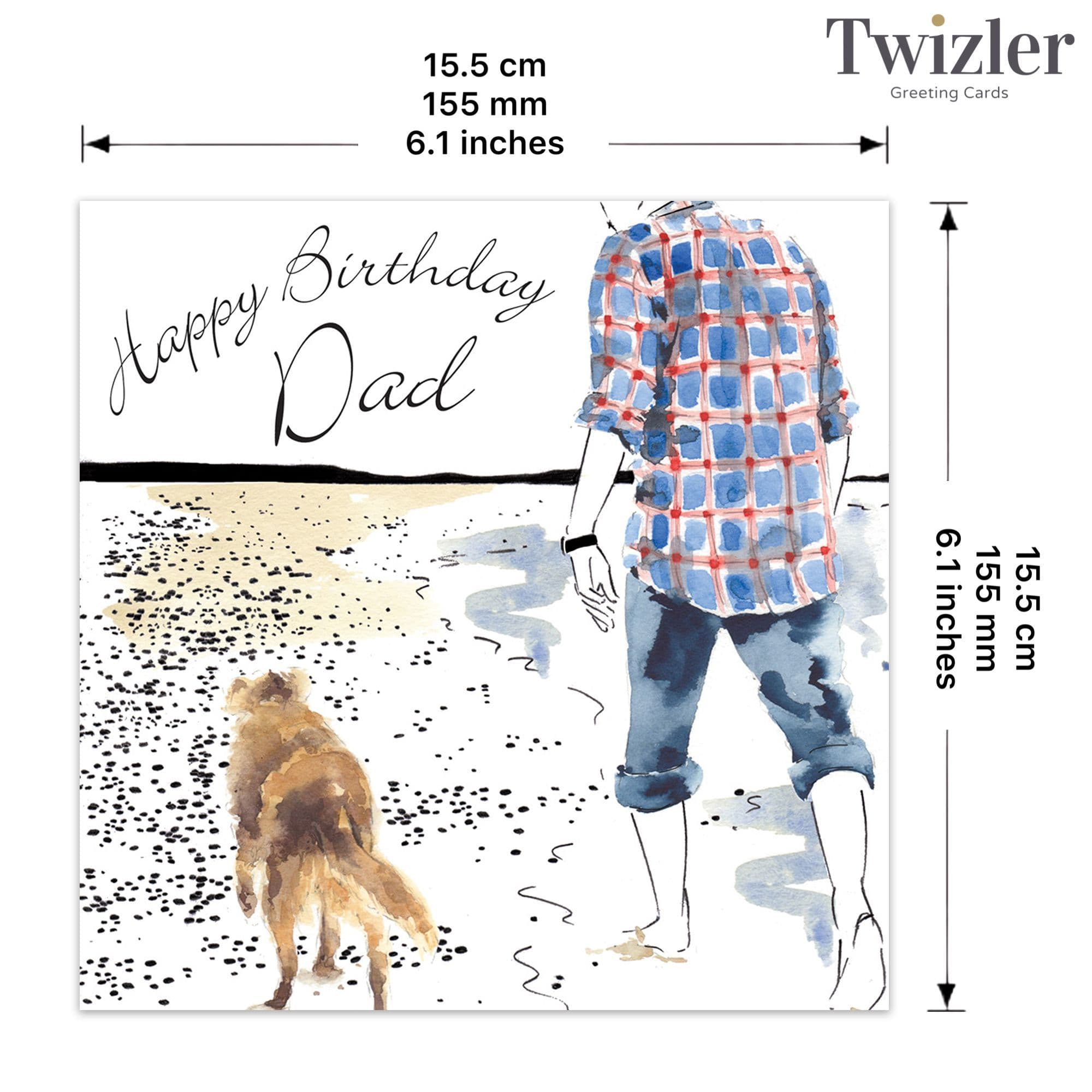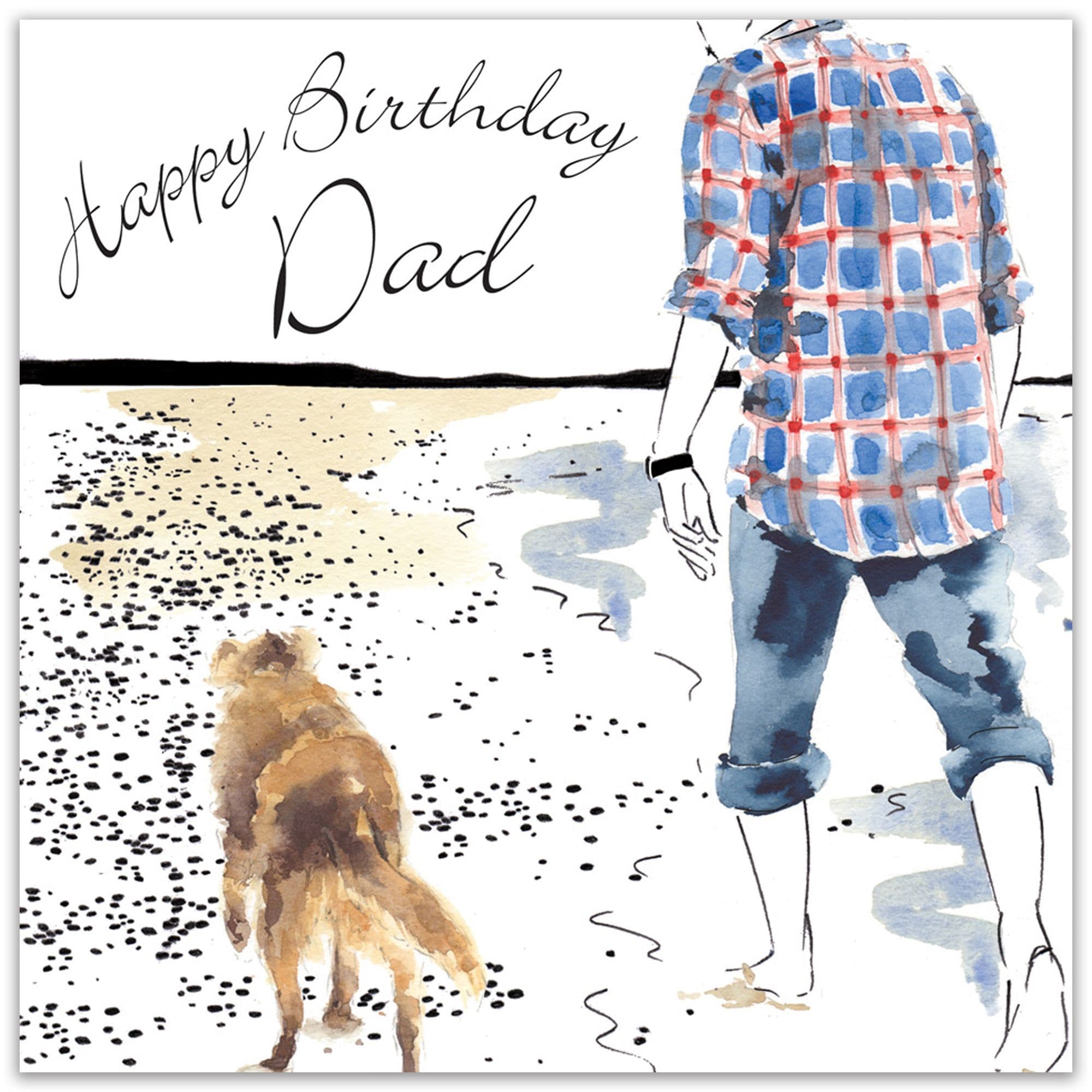 Part of our sumptuous range, this Happy Birthday Dad Card is stylish and sophisticated - the perfect choice for a special dad's birthday. This gorgeous card features a watercolour illustration of a man taking a walk on the beach, with his dog for company. It is finished with a silver foiled background and is perfect for that special man's birthday. This card reads Happy Birthday on the inside.