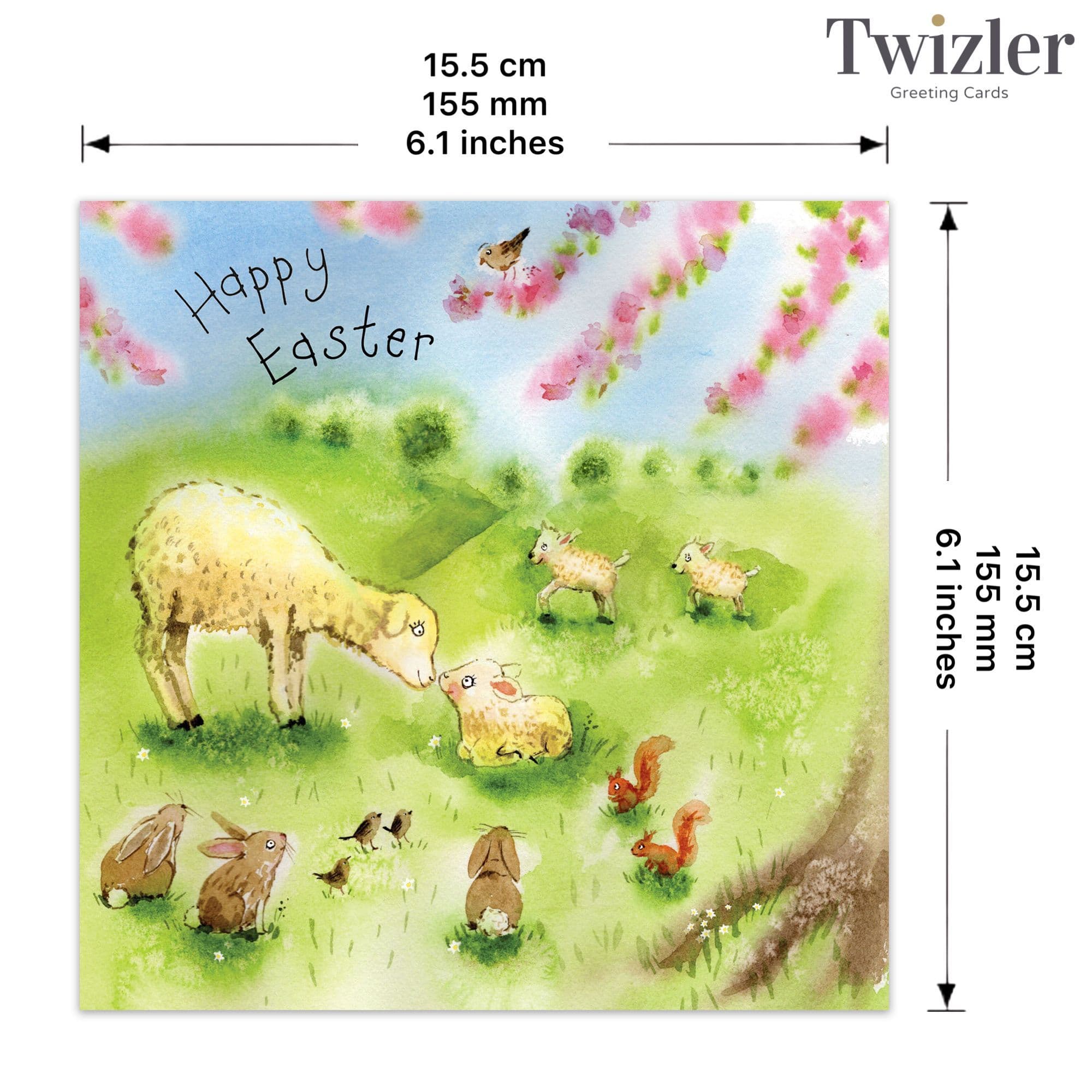 A beautiful Easter card featuring a mother sheep nuzzling her lamb. The perfect card to reflect the arrival of spring and to wish someone a Happy Easter especially someone who loves cute lambs!