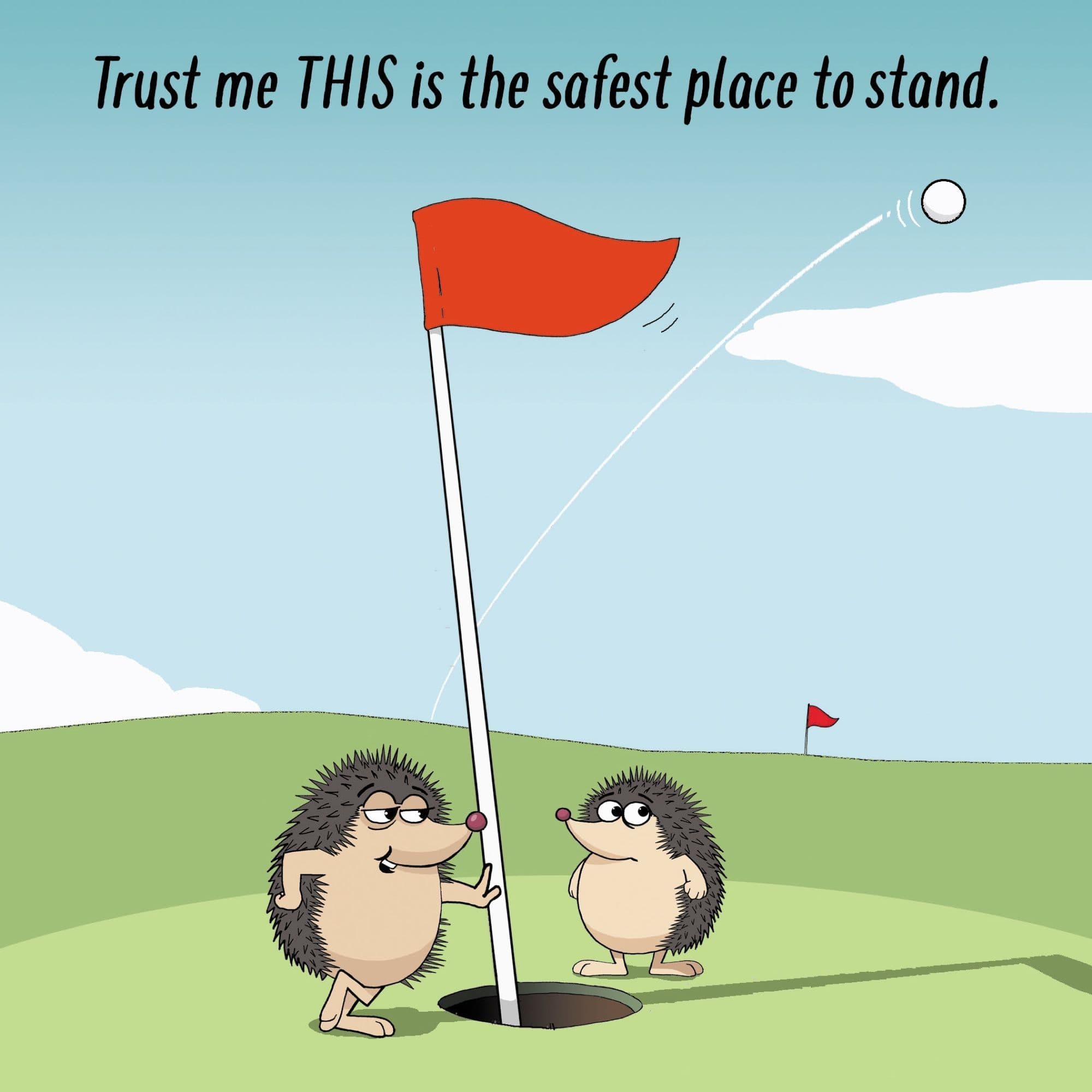 A funny card for that golfer in your life perfect for a birthday, special occasion, Fathers Day Card or perhaps just to wind up a golfer after a terrible day on the course! This card features two hedgehogs who have been on this course before and worked out the safest place to stand!