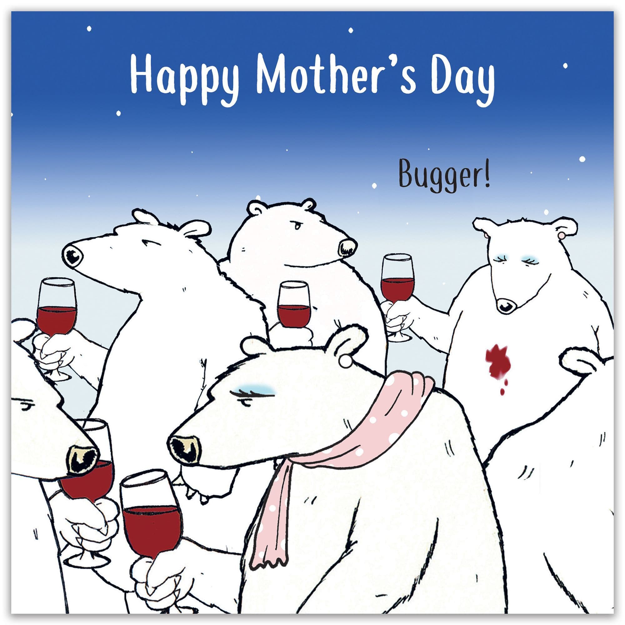 Twizler's signature red wine drinking Polar bears feature on this hilarious Mothers Day card. This time, two Mums are included in the party, one of whom has spilt red wine on her white fur and exclaims Bugger!. Perfect for that Mum with a great sense of humour and who has a tendency to resort to expletives! This card reads Happy Mothers Day on the inside.