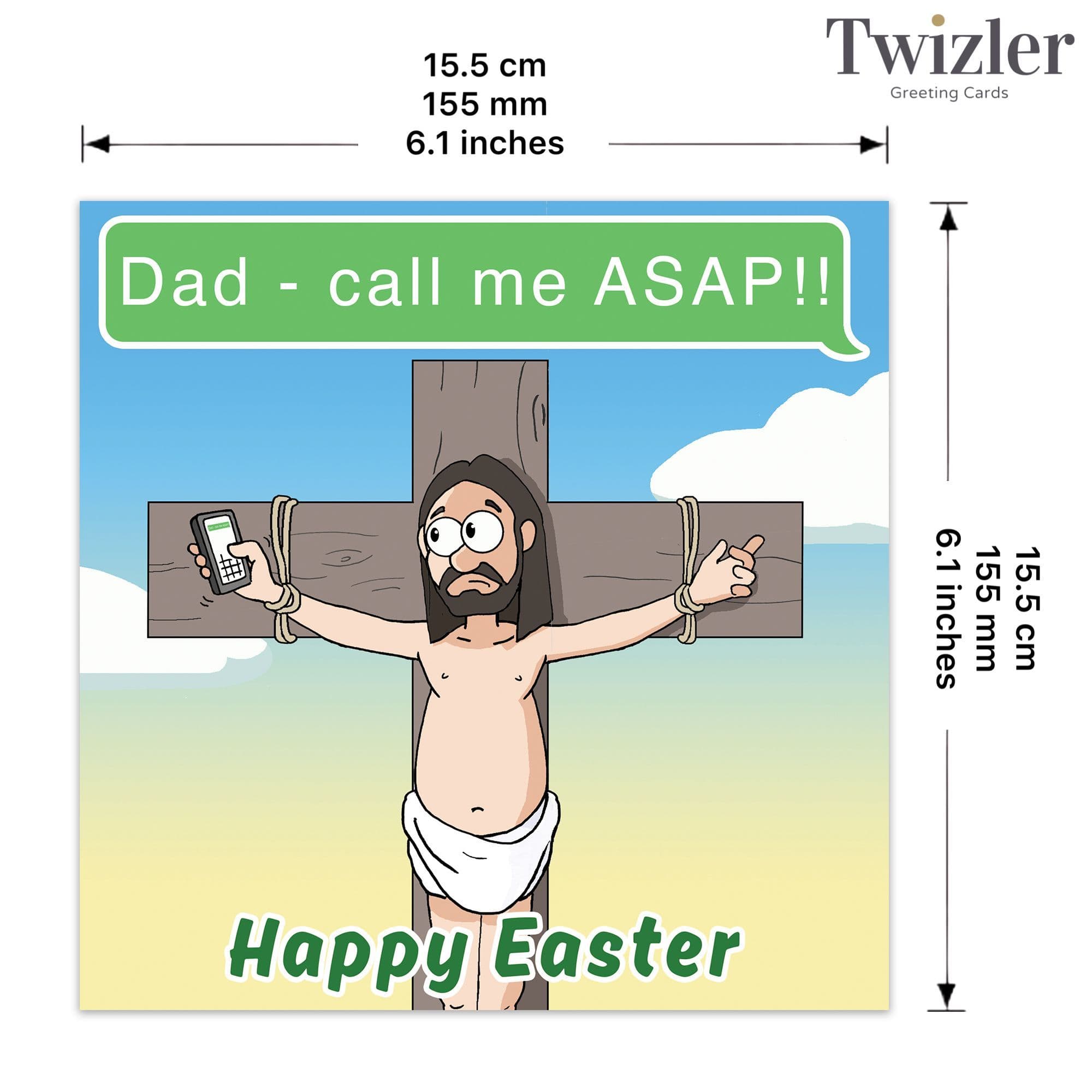 The words on the front of the card read Dad - call me ASAP!! and Happy Easter