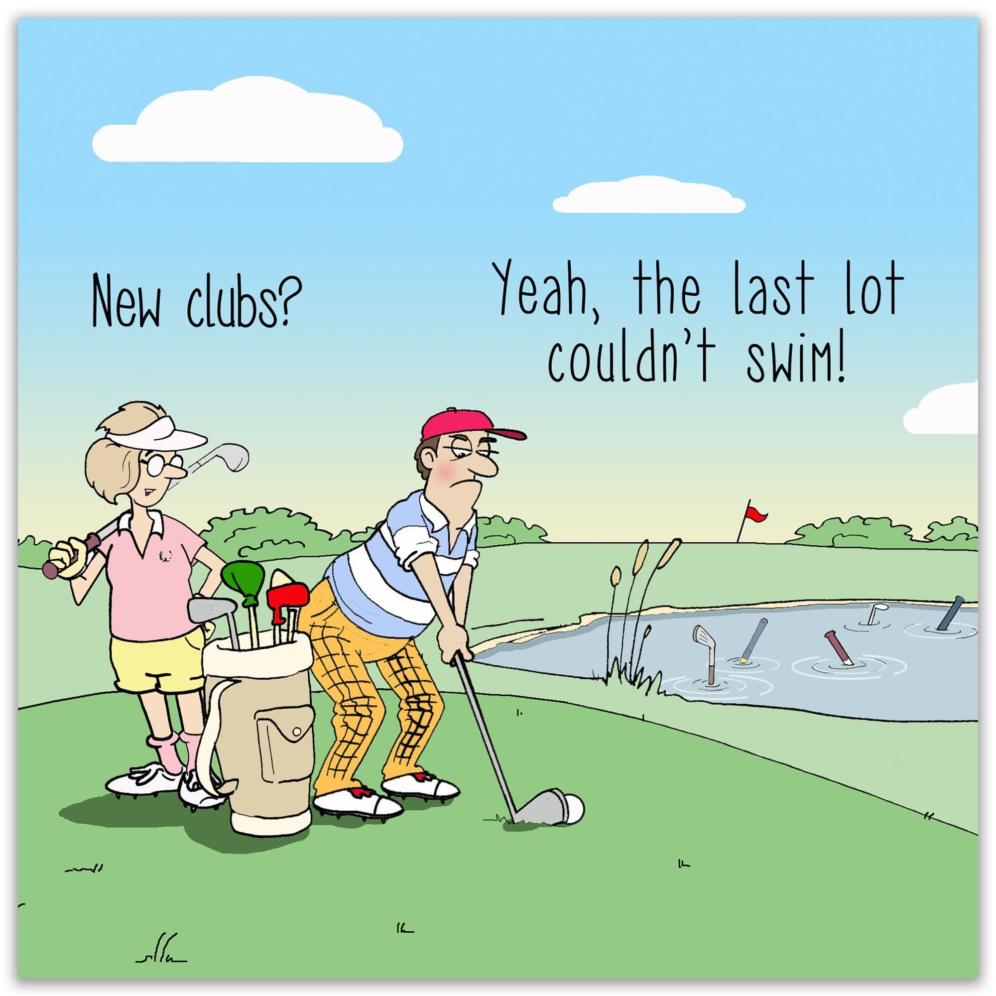 The words on the front of the card read New Clubs? and Yeah, the last lot couldn't swim!