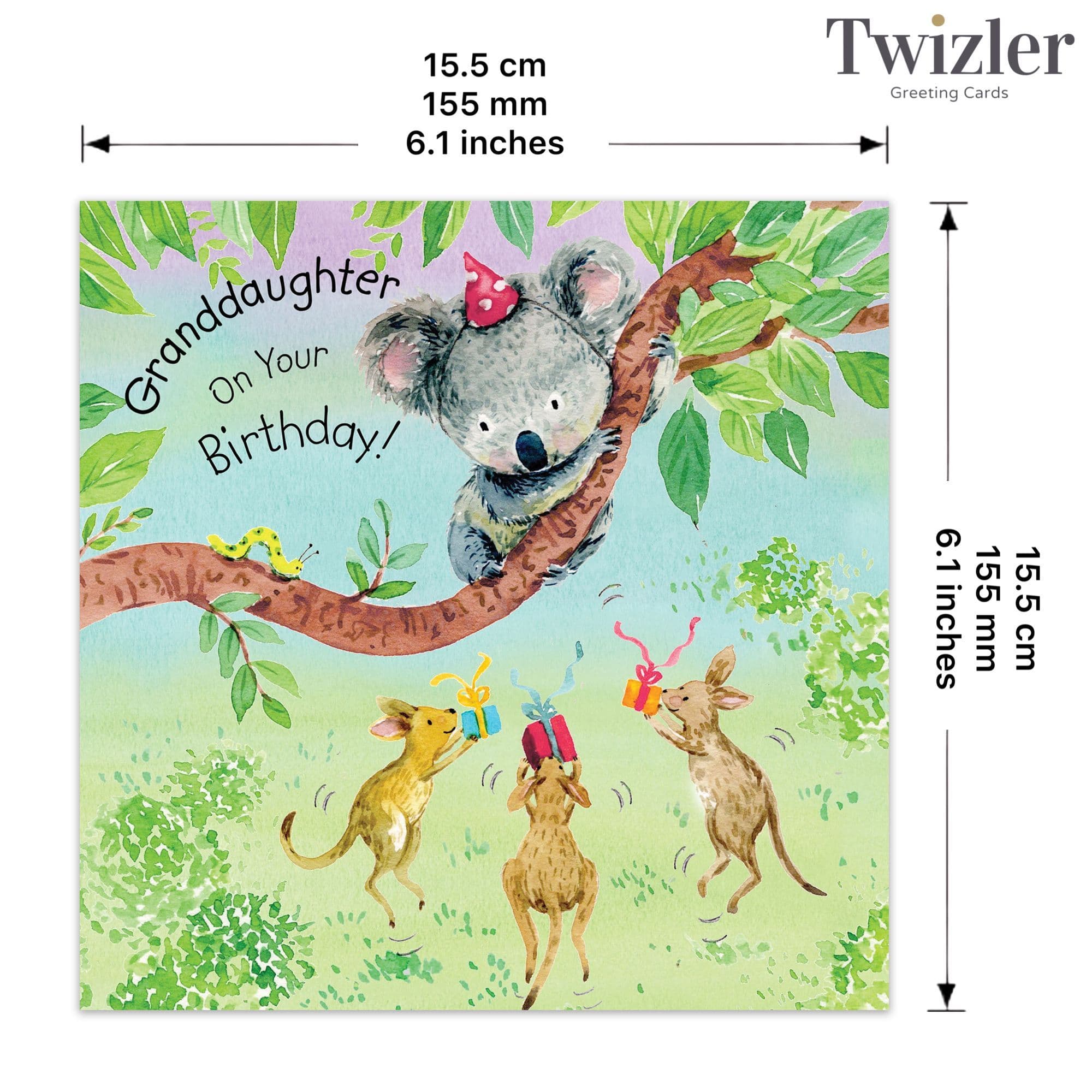 A gorgeous card to celebrate a special Granddaughters birthday. Part of our Tiger Tots range, it features a cute Koala wearing a party hat on the branch of a tree with 3 kangaroos waiting below with gifts. This is a beautifully drawn card, coloured in pastel blues and greens perfect for sending birthday wishes to your Granddaughter. This card reads Happy Birthday on the inside.