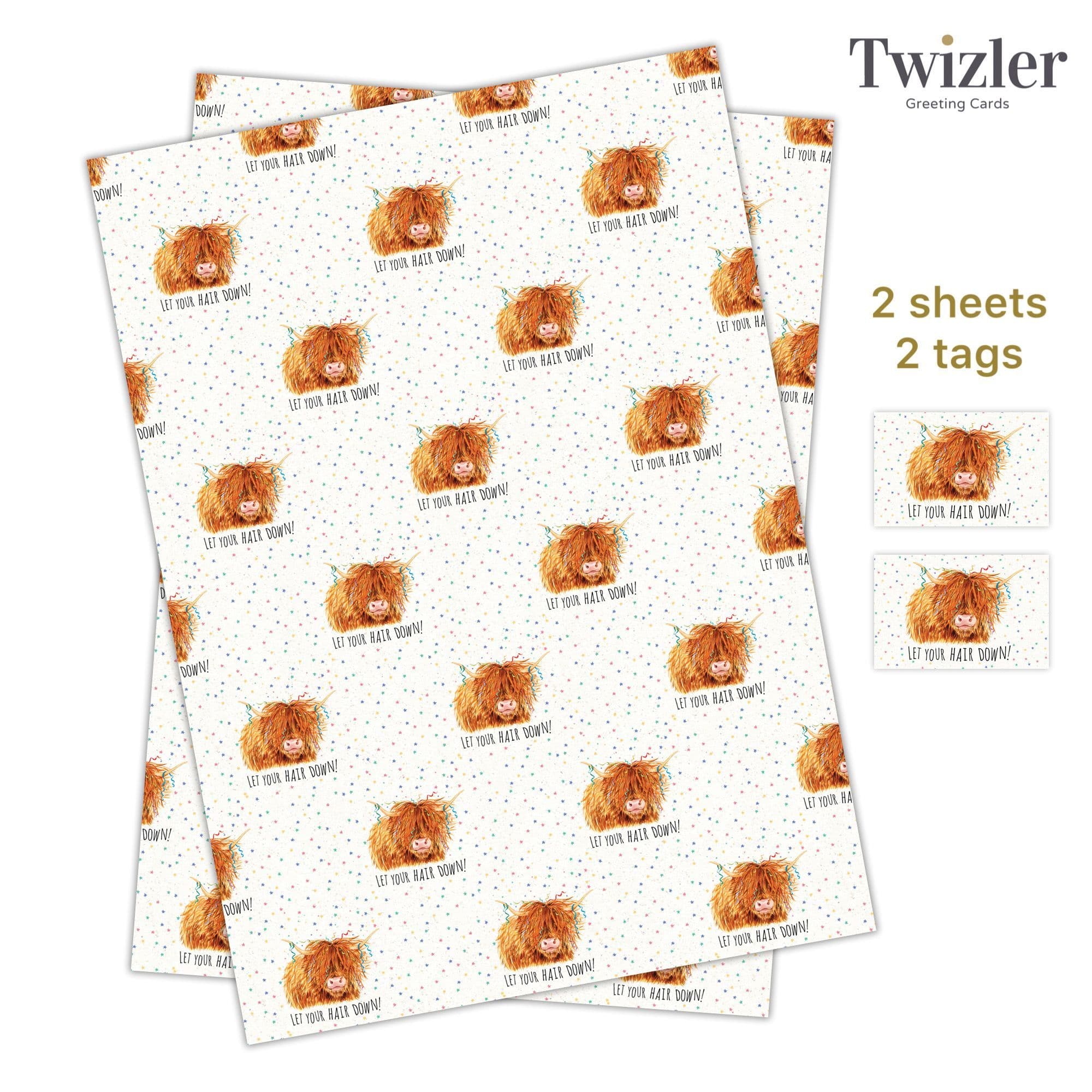 Happy Birthday Wrapping Paper - Women Scottish Highland Cow - 2 Sheets & 2 Tags - Funny Gift Wrap