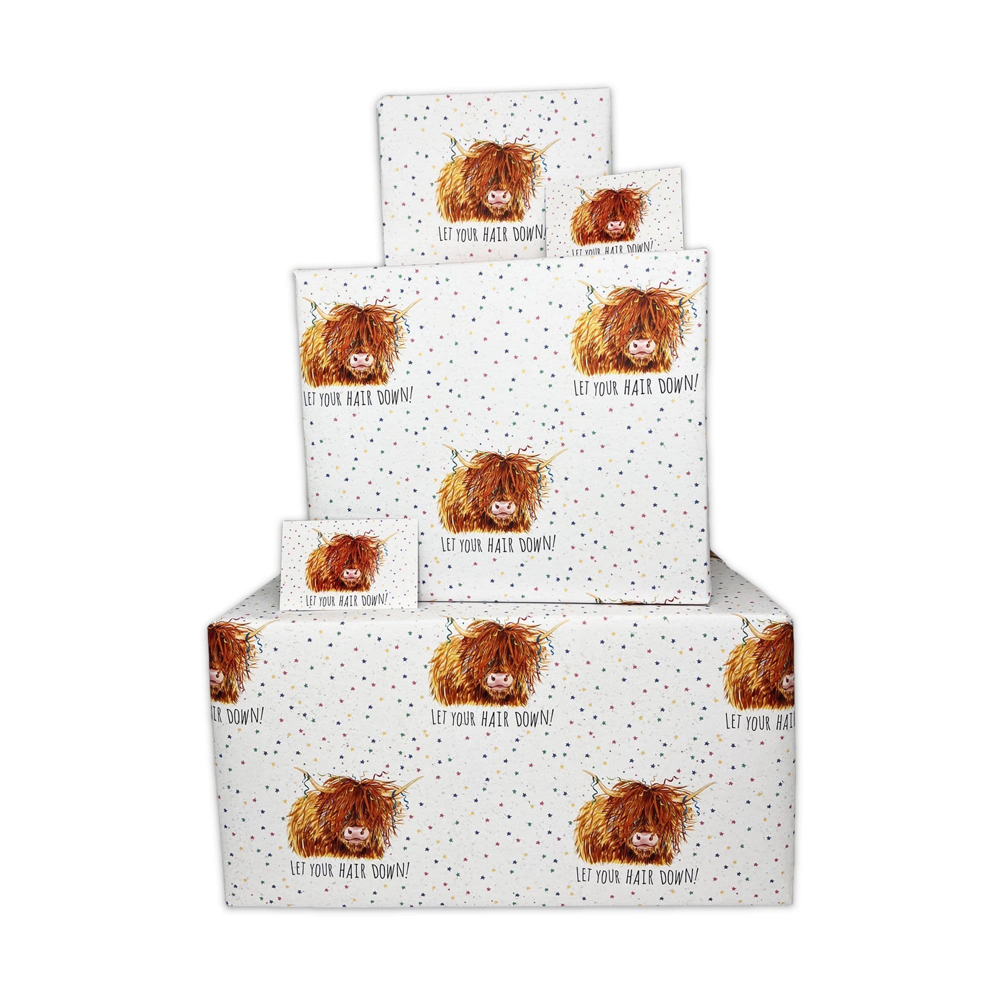 Happy Birthday Wrapping Paper - Women Scottish Highland Cow - 6 Sheets & 6 Tags & Matching Card