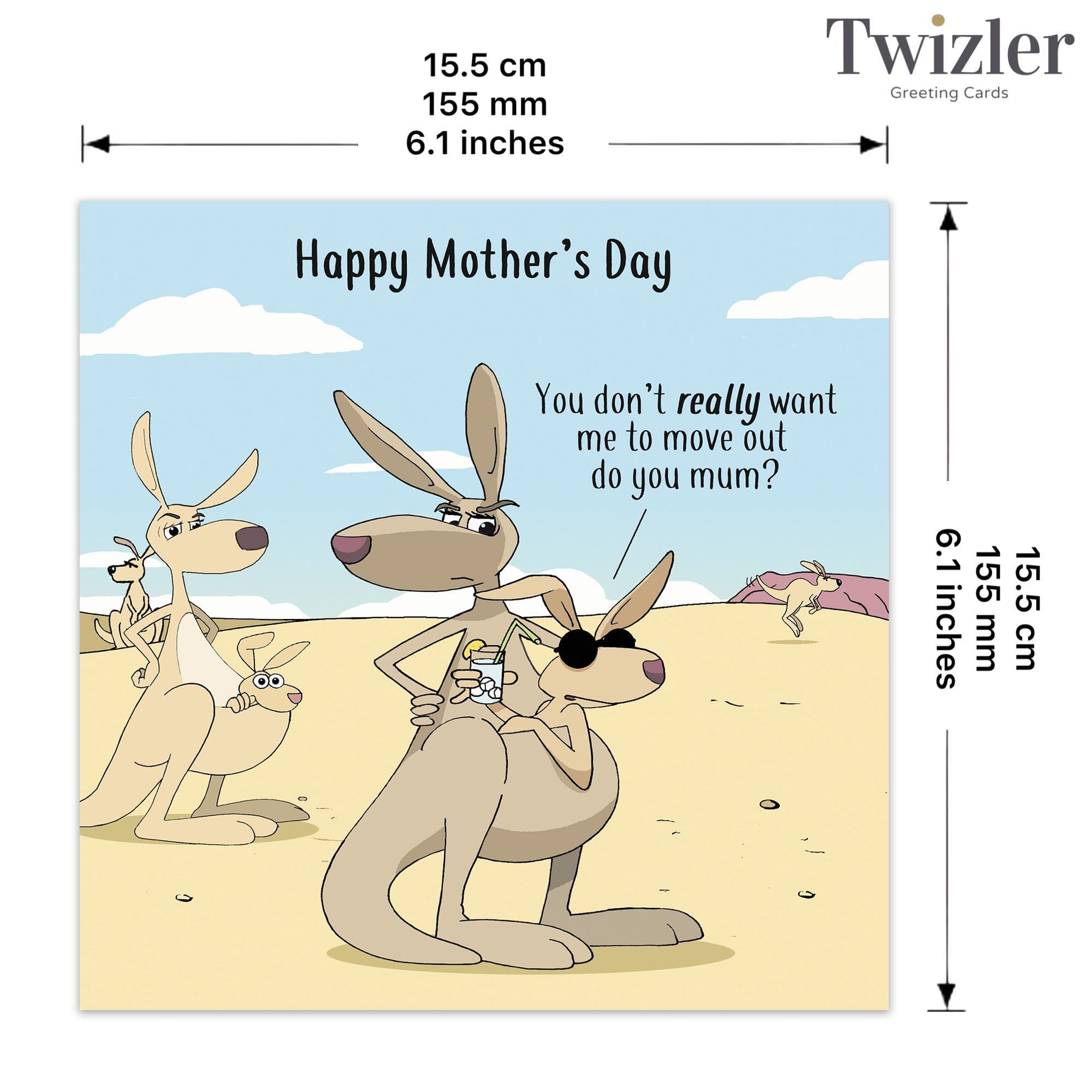 Our hilarious Mothers Day card features a Mum kangaroo with an overgrown Joey wearing shades and clutching a drink in her pouch. The words read You don't really want me to move out do you mum? The perfect card for Mum if you're still living at home! This card reads Happy Mothers Day on the inside.
