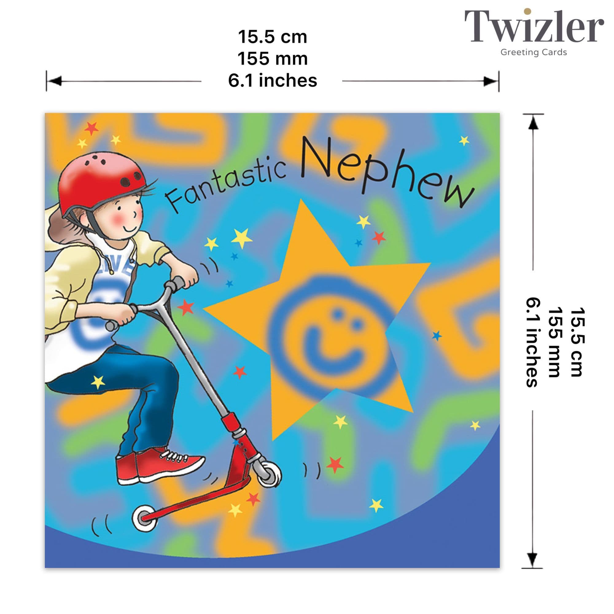 A great birthday card for a special Nephew. Featuring a cool boy playing on his new scooter, with a graffitied star in the background, it is the perfect choice for that special boys birthday. This card is blank inside for your own message.