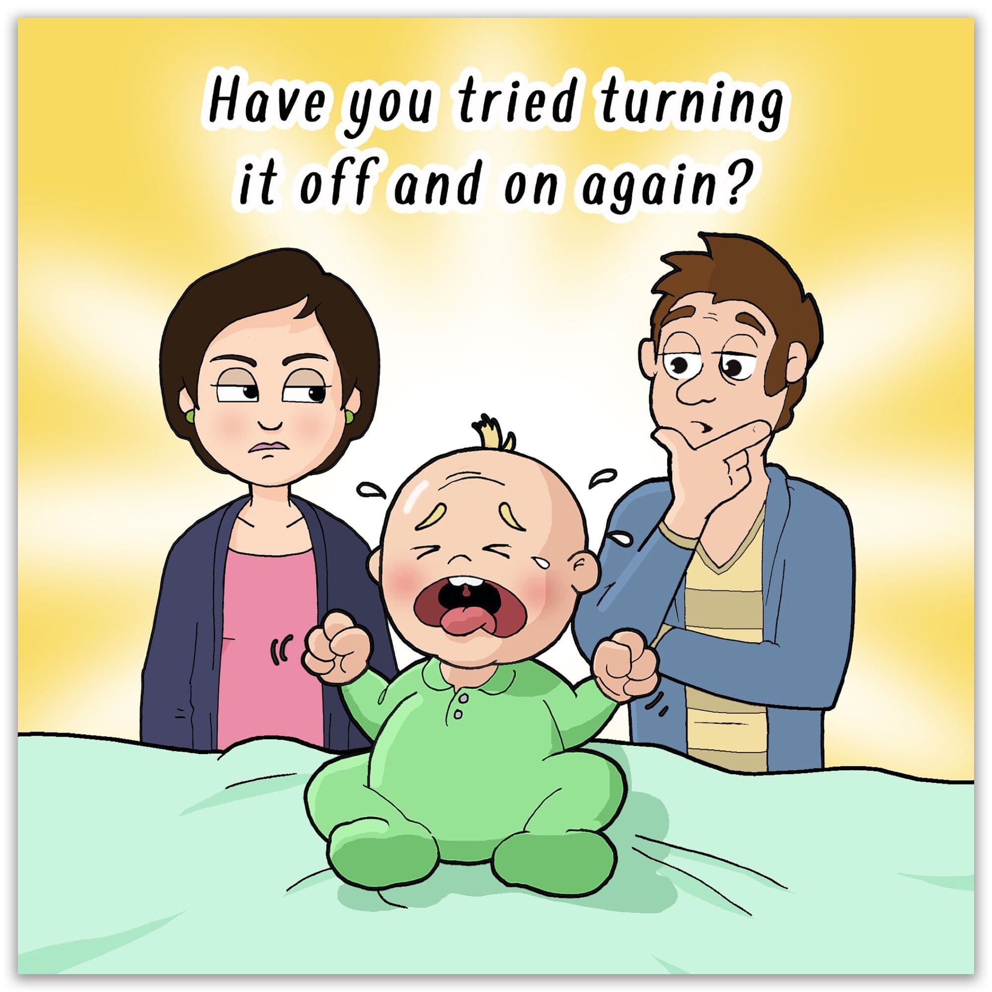 A humour greeting card for the happy parents to be. Gender neutral, it is perfect for a new baby boy card or new baby girl card. This card features a baby who is giving Mum and Dad a hard time - not sure they have the solution yet!