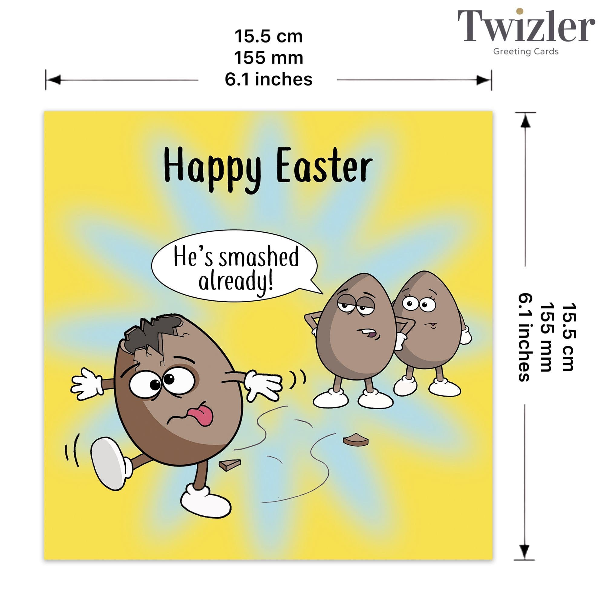 Another funny Easter card from Twizler! It features a couple of choclate eggs looking on as a third weaves about looking worse for wear, with his head cracked open. The card reads Hes smashed already! Perfect for anyone who enjoys a drink or two or perhaps just likes a good joke. This card reads Happy Easter on the inside.
