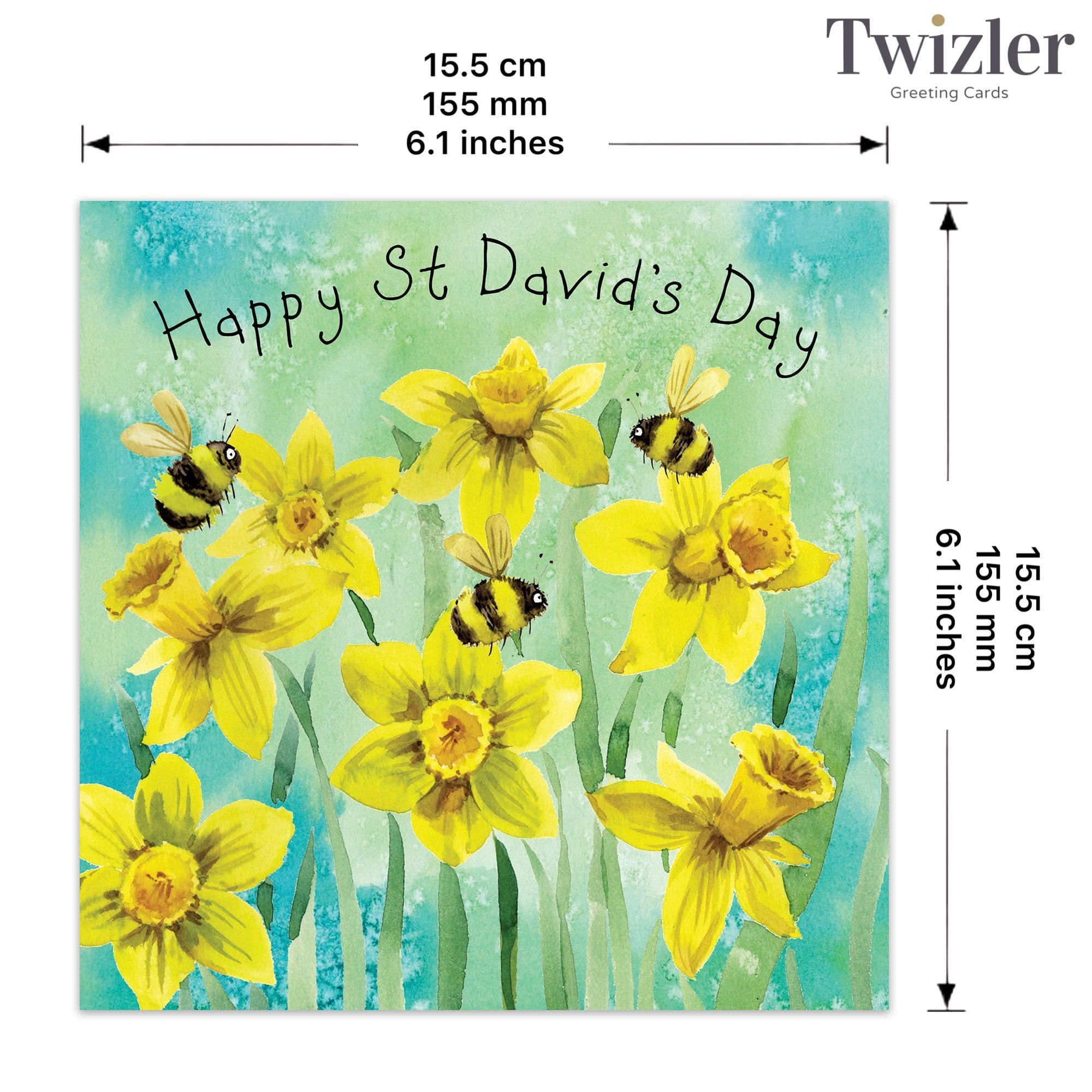 Our beautiful Happy St David's Day card features an array of daffodils and bumble bees. Perfect for sending wishes on this special day