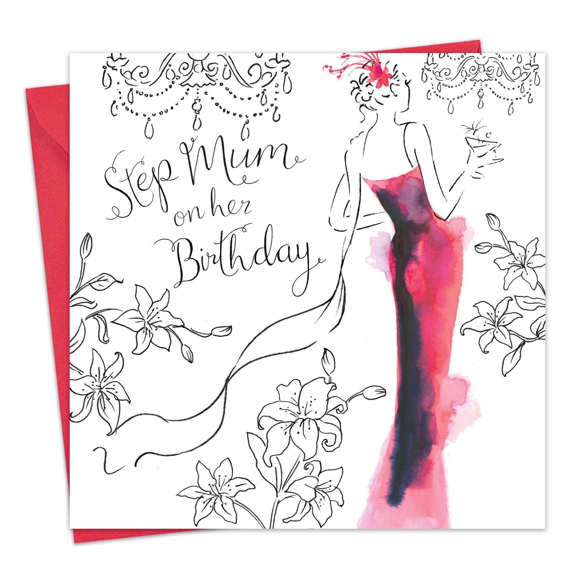 A fabulous and elegant Step Mum Happy Birthday card from our Sumptuous range. This is a beautiful and sophisticated card which is the perfect choice for a special Stepmums birthday. This gorgeous ladies birthday card features an elegant cocktail dress, is finished with a silver foiled background and is perfect for that fashion orientated Stepmother. This card reads Happy Birthday on the inside.