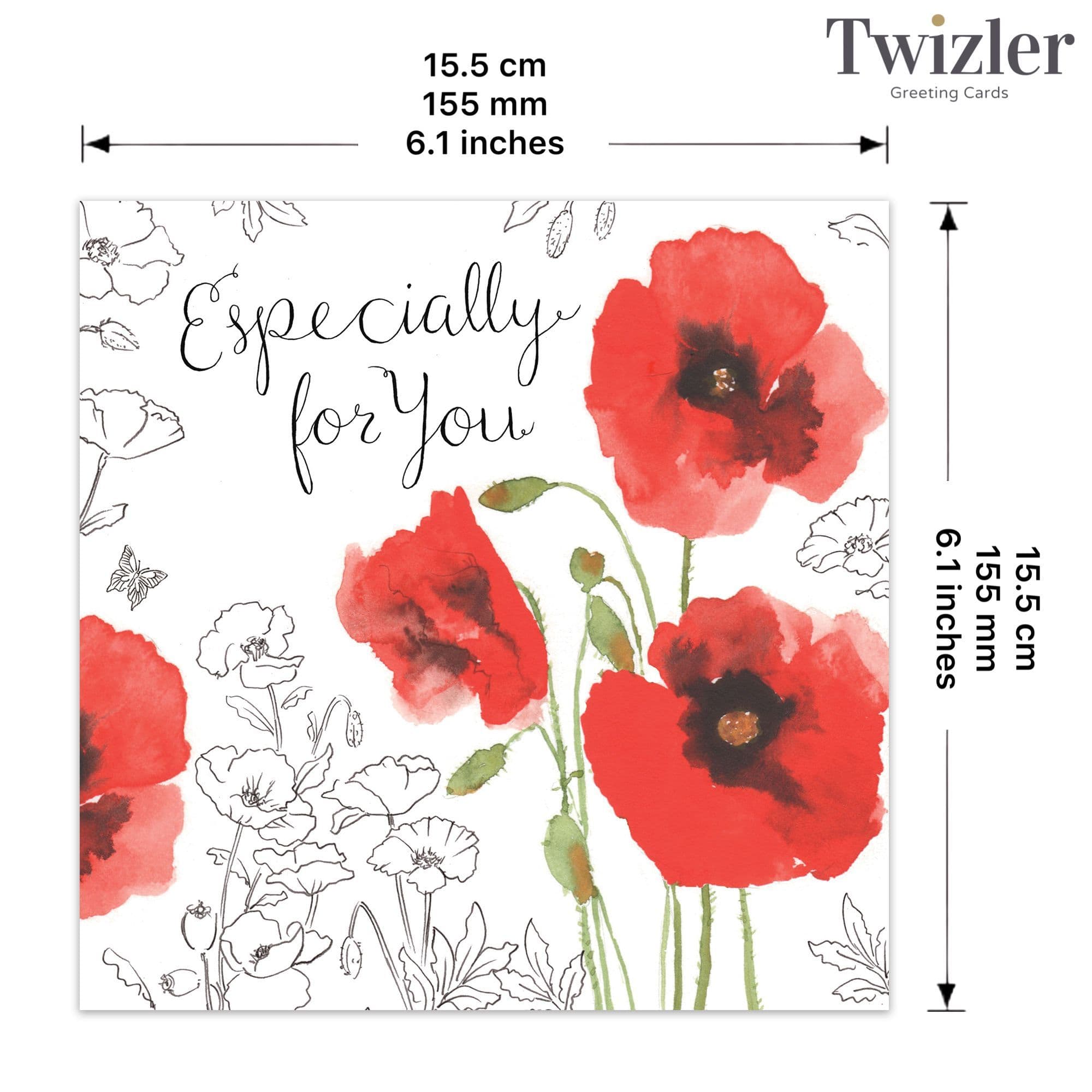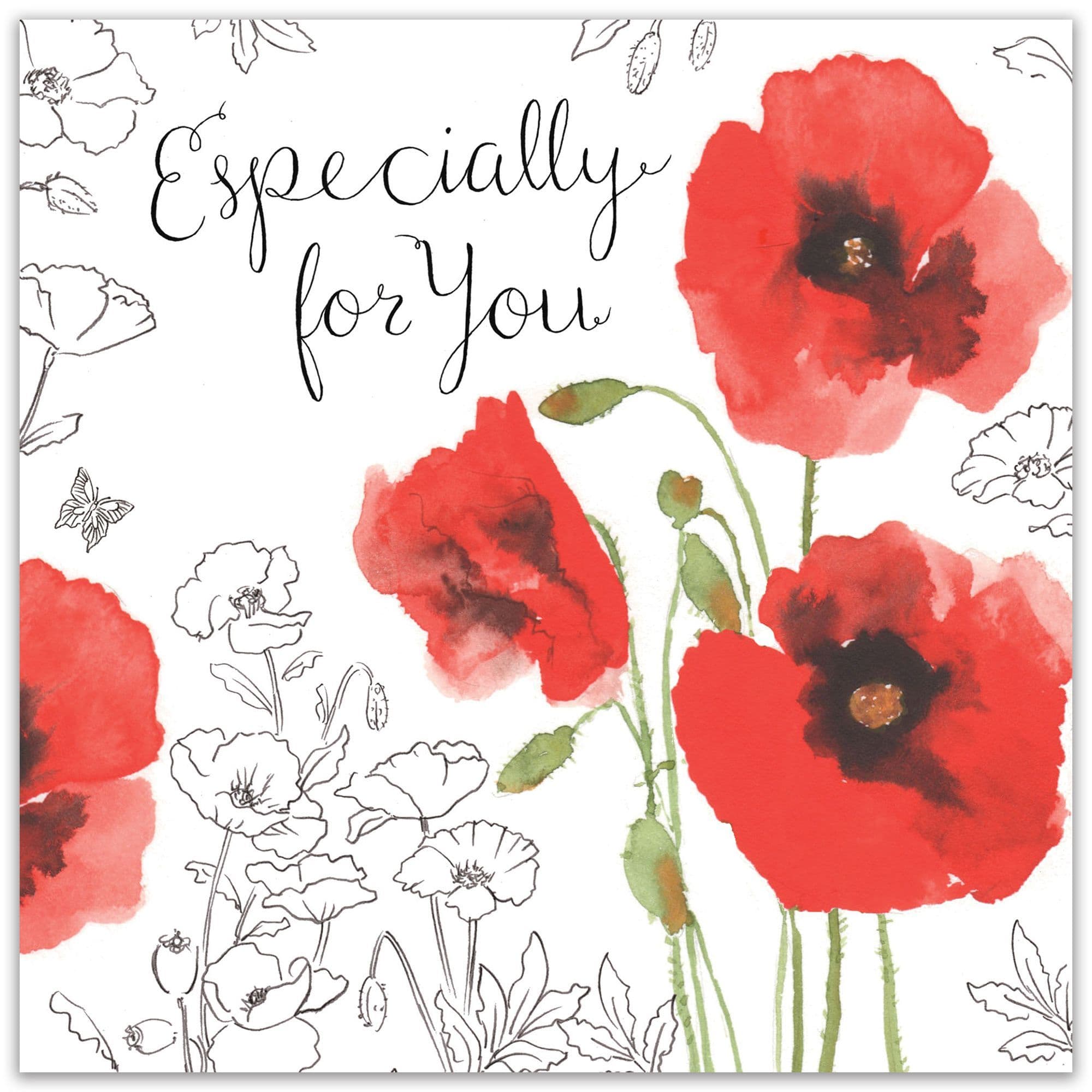 Our lovely Happy Birthday card featuring watercolour red poppies is a beautiful way to send birthday wishes to someone special. This gorgeous card is finished with the words Especially for You on a silver foiled background. This card reads Happy Birthday on the inside.